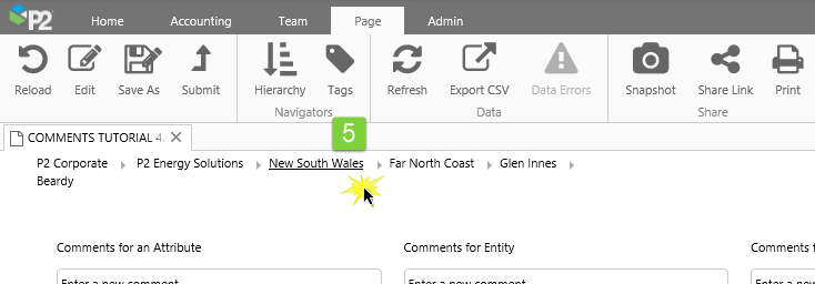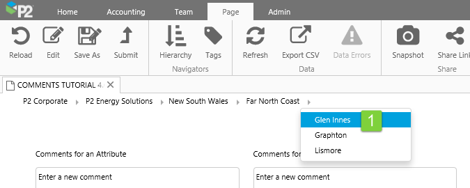 We're going to start by adding comments to various entities selected using the Breadcrumb component, and then we'll finish by seeing how those comments appear for the Comments Button with a Hierarchy specified.