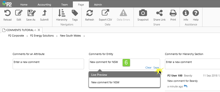 1. Type a comment in the edit box for the first of the new comments components, then click Save or press Enter.