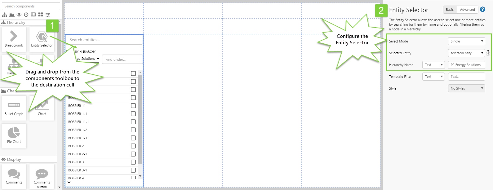 For selectedEntity, type the name of a relevant entity from the hierarchy configured through your Entity Selector (e.g. Bossier 11).