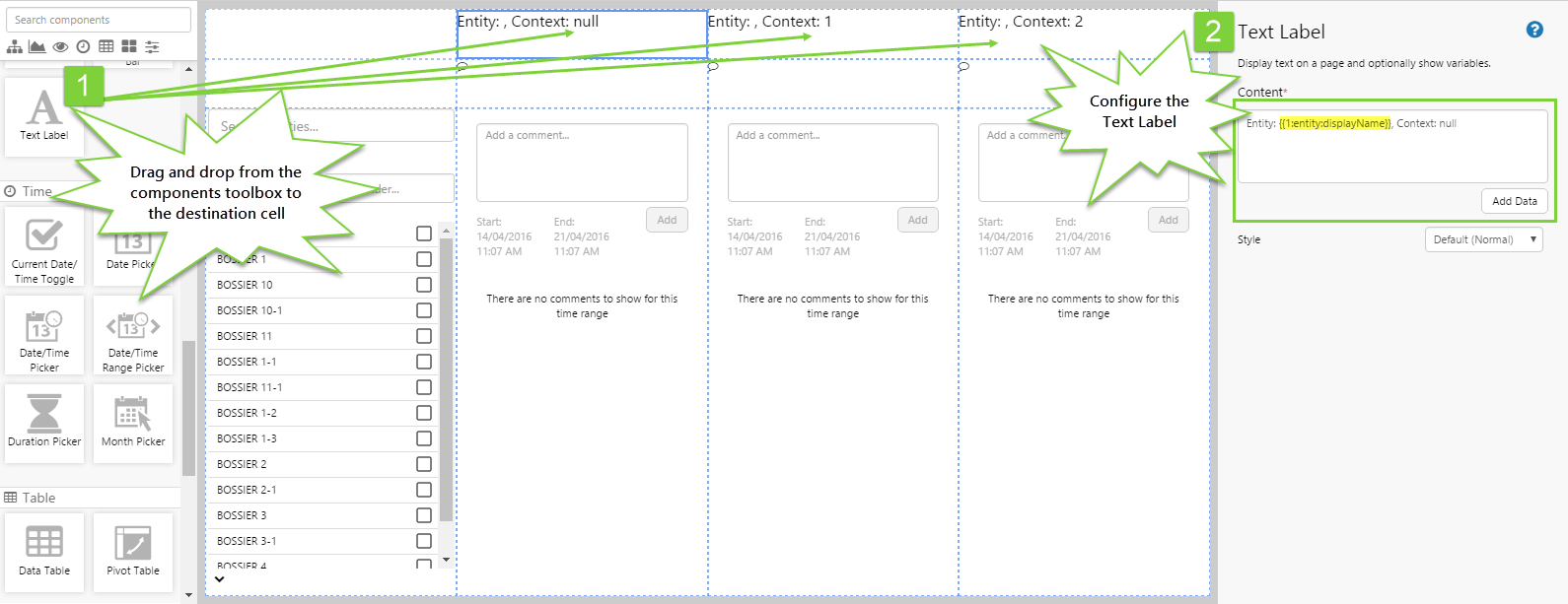 Drag and drop 3 Text Label components onto the cells above the Comments Buttons. Configure the first Text Label as follows: