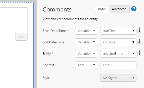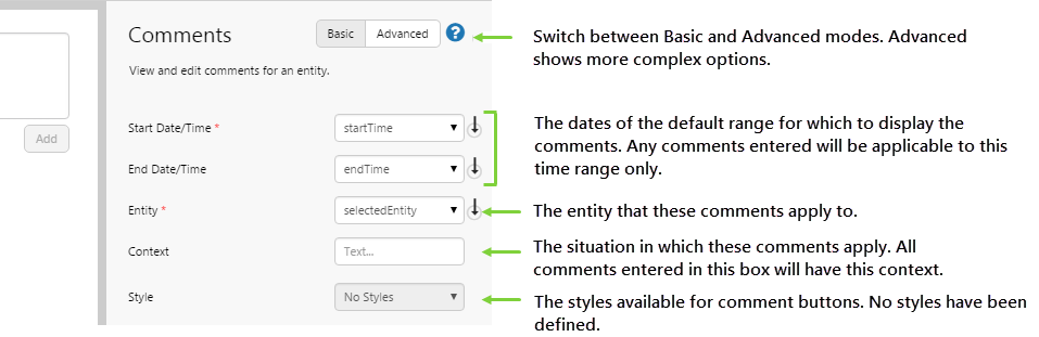 Both the Comments and Comments Button components have the same configuration options. There are 2 configuration modes. Basic mode (shown below) shows the options most commonly used. Advanced mode allows you to change the type of properties used.