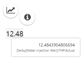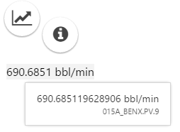 The data label displays a single data value, and is often used on schematics to display the value of a single entity attribute. There is also a link to trend data and a point details page for the tag or attribute, respectively. Tags and attribute values that can be overwritten have a write option.