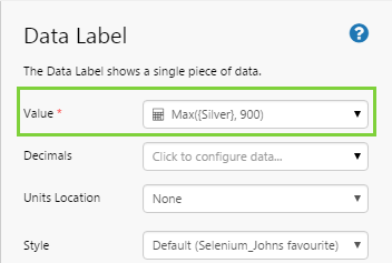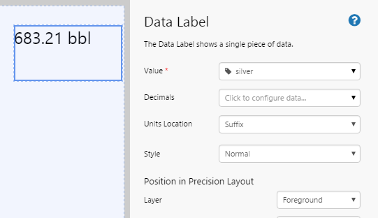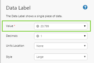 There are five separate categories of data that you can select for your data label Value. Likewise, you can configure Decimals to use any of the five categories.