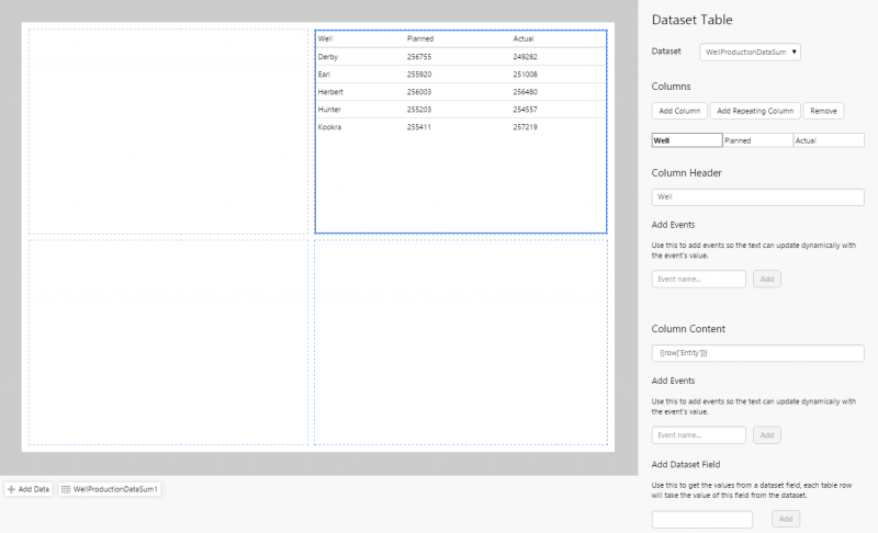 • Add the WellProductionDataSum1 dataset, and configure it as follows:
