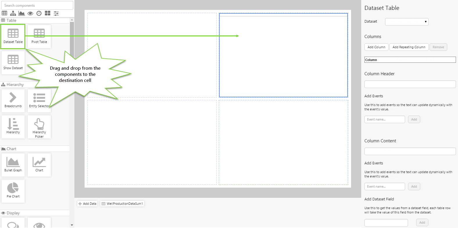 Drag and drop the Dataset Table component onto a grid cell.