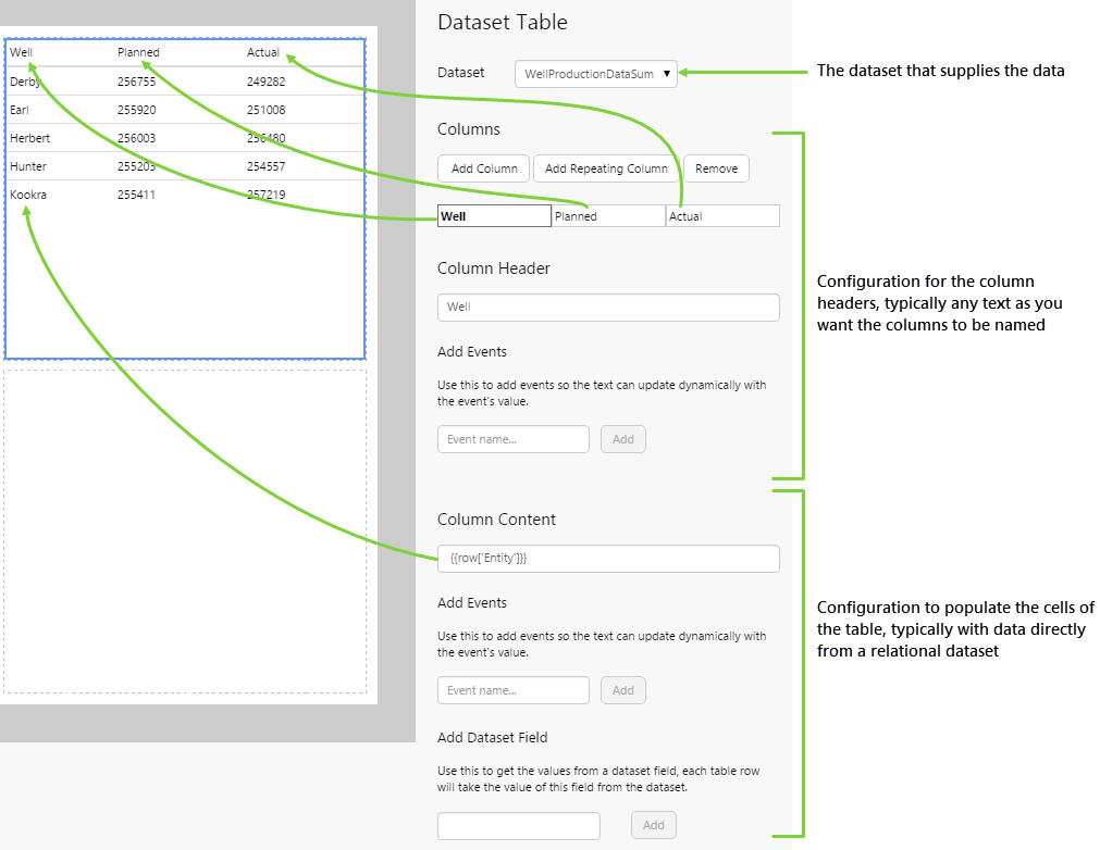 Add Dataset Field: The name of the column in the dataset to use in order to populate this column of the Dataset Table.