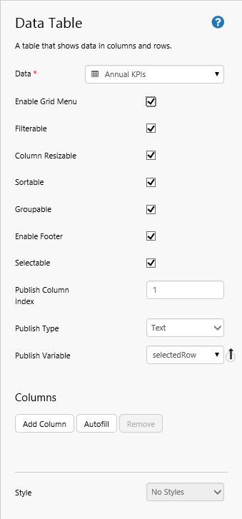 Columns Add columns to display in the table. Available columns depend on the data table's data.