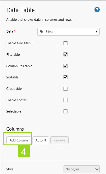Dataset Query Columns: Configure your data table's Data to use a column from a dataset query: Using Dataset Data