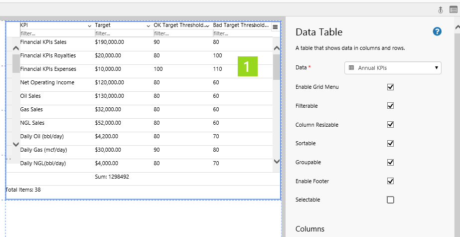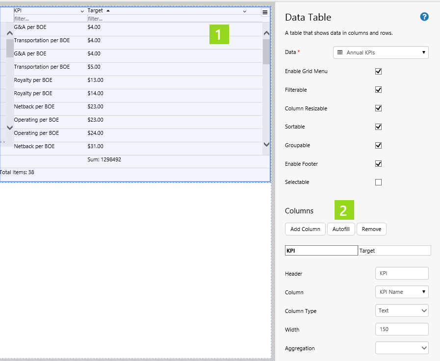 There are also data table configurations that are set in design time, for example column aggregation (such as sum, average, minimum), column titles (headers) and the table footer.