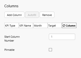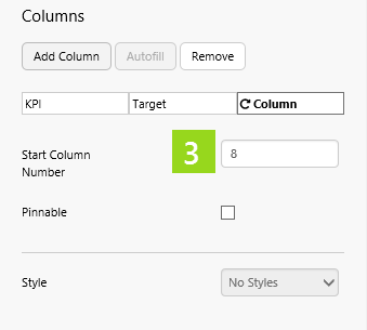 Note: Start Column Number refers to column position in the dataset (counted from the left). If you're not sure which column to start from, click the data table's Data property to open the data panel, then click Preview. Count the column numbers from the left.