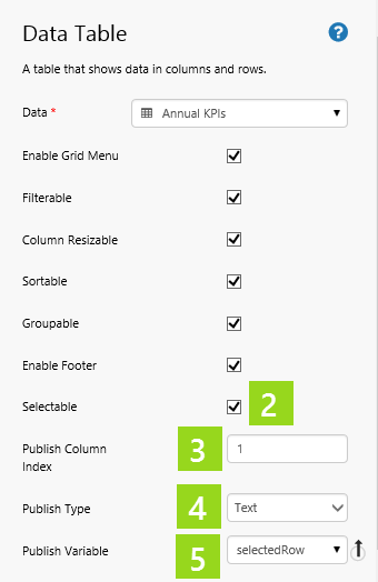 Publish Column Index The column number; used in conjunction with the selected row, a single data value sets the Publish Variable. (Only available if Selectable is selected.)