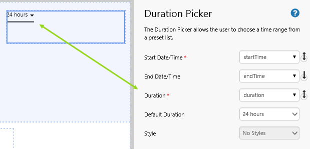 The Duration Picker component allows a user to select a duration from a drop-down list. This sets the a datetime variable linked to Start Date/Time, as well as a text variable linked to Duration.