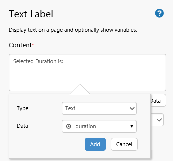 1. Drag a Text Label onto the top left of the page. In the text label's Content type Selected Duration is: then click Add Data and add the Duration Picker's Duration text variable, duration.
