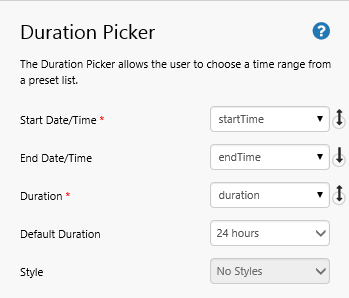 | Style: | The style you want to apply to the component. If you are a Style Administrator, you can create a new Duration Picker style. |