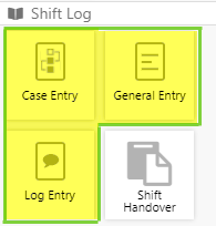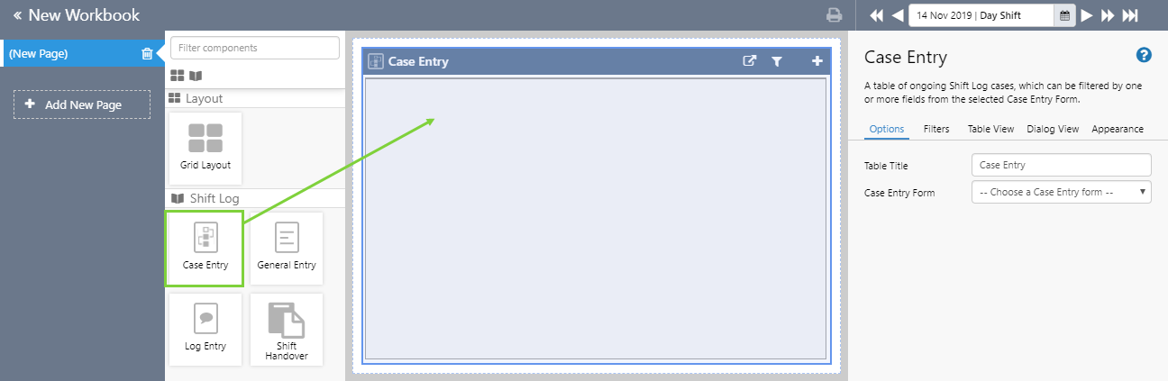 Drag and drop the Case Entry component onto a grid cell. The entry components are in the Shift Log  group.