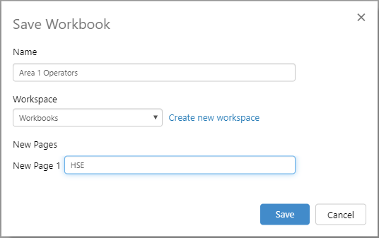 • If you have an unsaved page in the workbook, you will also be asked to name the page. Note that the name cannot be the same as an existing page in the workspace (so you cannot have 2 pages called HSE in 2 different workbooks in the same workspace).