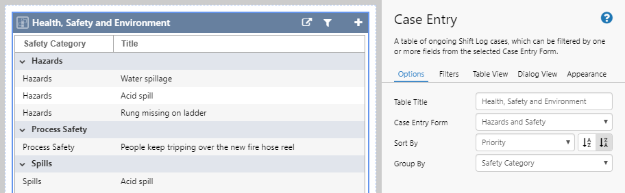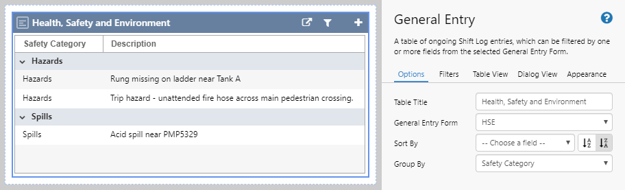 Group By: By default, entries are shown in a flat list. You can choose a named list from the chosen Form by which to group the entries. This grouping is similar to the "topics" in previous versions of Shift Log.