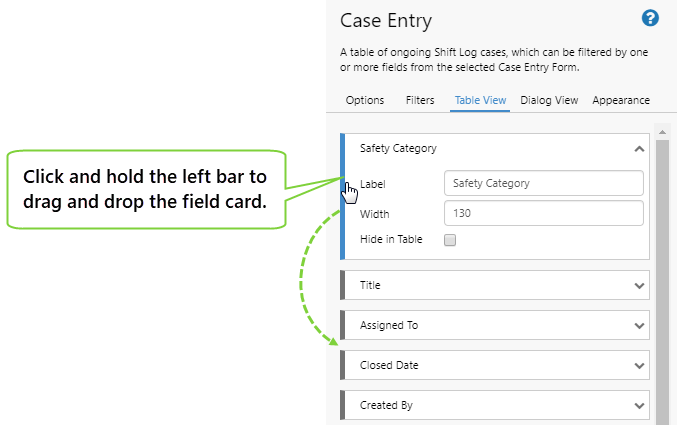 • Drag and drop a card to change the order of the columns in the table.