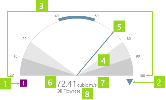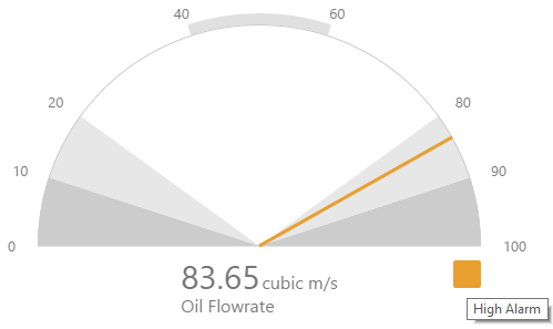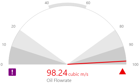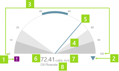 For example, you can configure a gauge to compare the actual value of the selected well's flowrate against limits defined for that well, or against tags that contain fixed values for the various limits.
