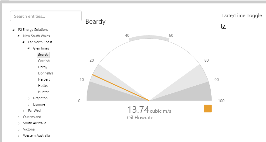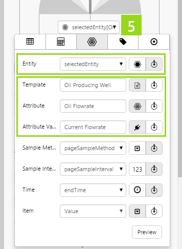 This assigns the selectedEntity's Oil Flowrate!Current Flowrate attribute value to the measured value: selectedEntity[Oil Producing Well]:Oil Flowrate!Current Flowrate. selectedEntity is a variable, which the end-user can change by selecting different entities from the hierarchy on the page.