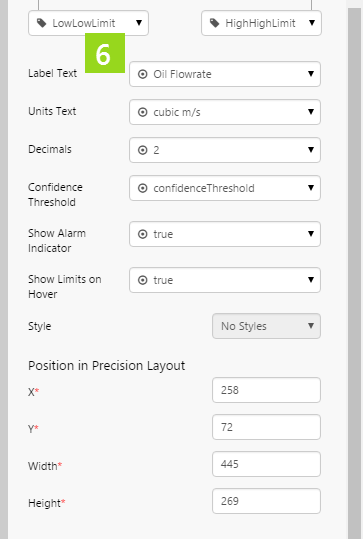 As well as defining the measured values and limits, you can define a label and units, and you can configure whether to show the alarm indicator and the limits.