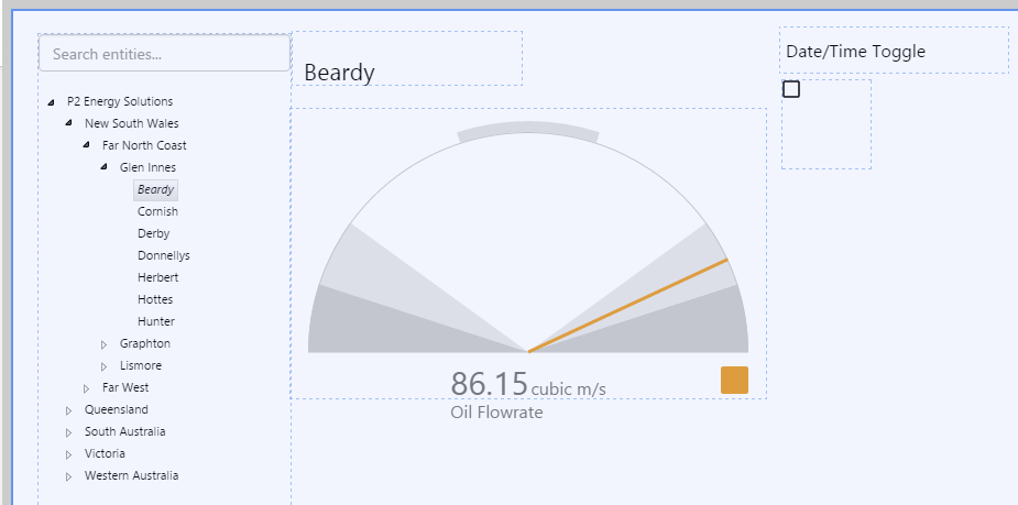 1. Drag a Gauge component to the right of the hierarchy. (If you are using the saved copy of the Pressure Meter/Level Meter/Temperature Meter page, first remove the Pressure Meter/Level Meter/Temperature Meter component, then move the date/time toggle and its label over to the right, to provide more space for the Gauge component.)