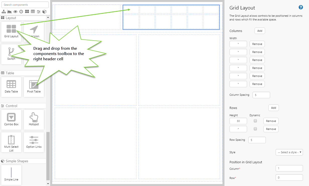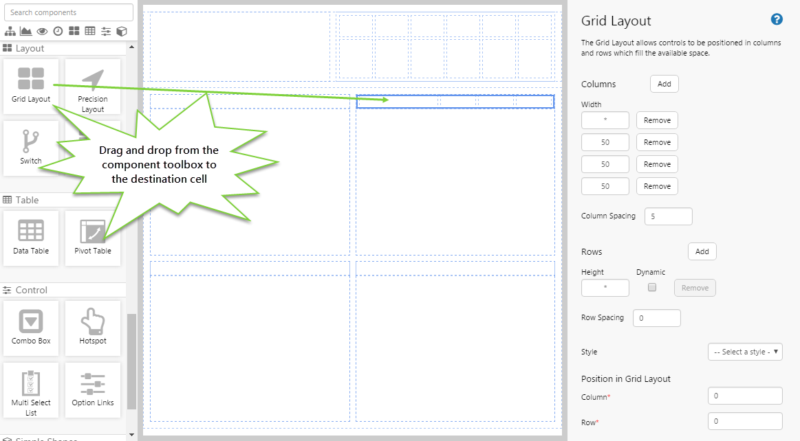 • You can move the contents of a grid cell by dragging and dropping it to another grid cell. Say you have a table in the top left cell, and you want to move it to the top right cell. You can just drag and drop it to the other cell without the table losing any of its settings. If the cell you are moving contains multiple components, say another grid with embedded components, then ALL of those components in that cell will move as a 'set'.