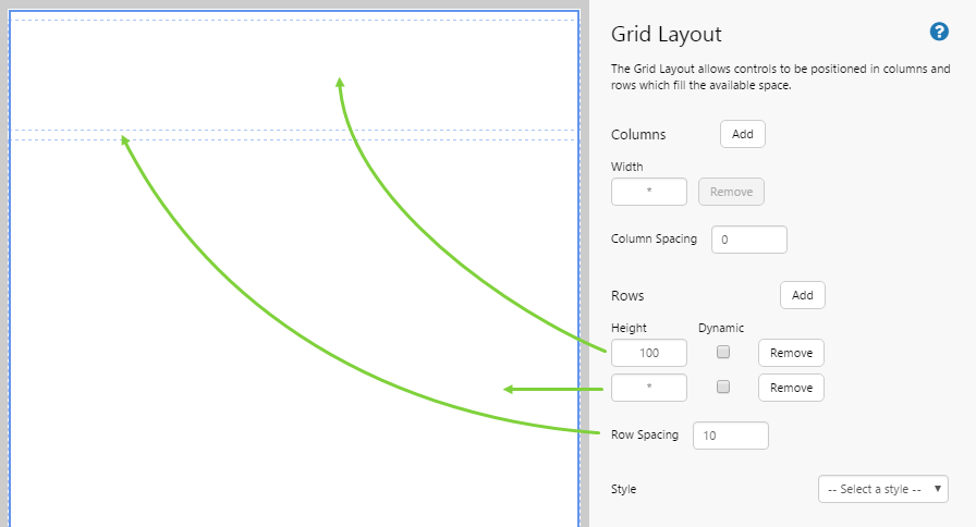 Height: The height of the row in pixels. You should only enter a number. Type * to allow the browser to automatically adjust the height of the row.