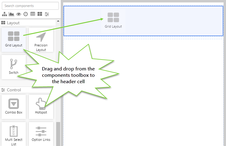 • Drag and drop the Grid Layout from the components toolbox on the left.