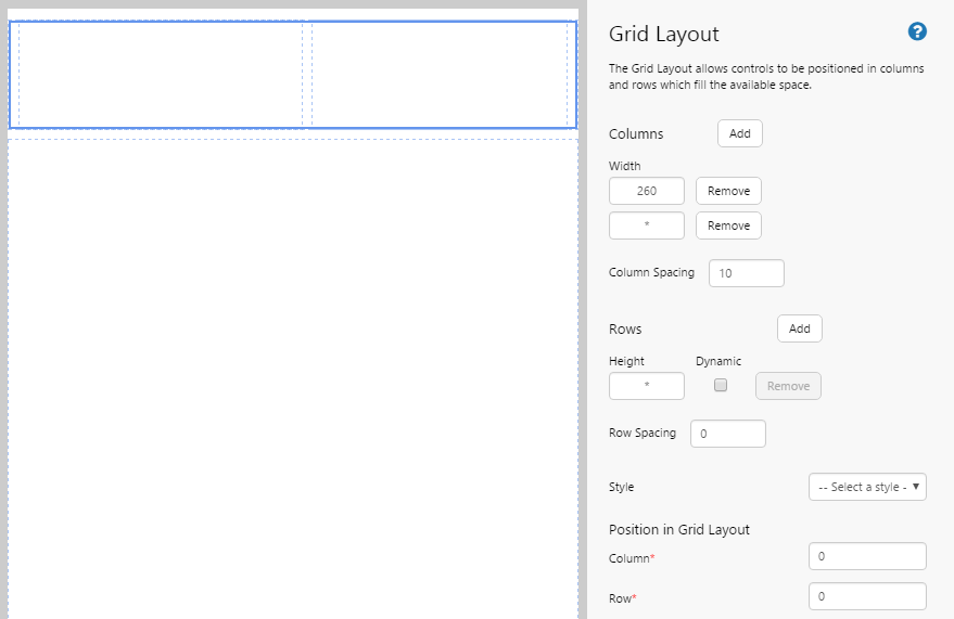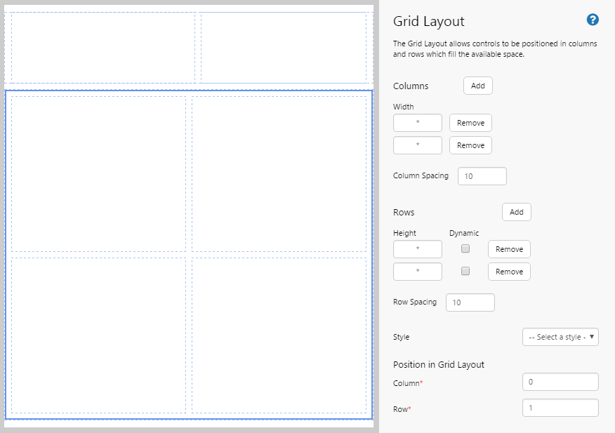 • After you have added a component to the Grid Layout, you can reposition it without having to go into the grid editor. Component editors have a "Position in Grid Layout" section after the configuration options, which allows you to specify which column and row you want to put the component into. The top left cell is specified as Column 0, Row 0.