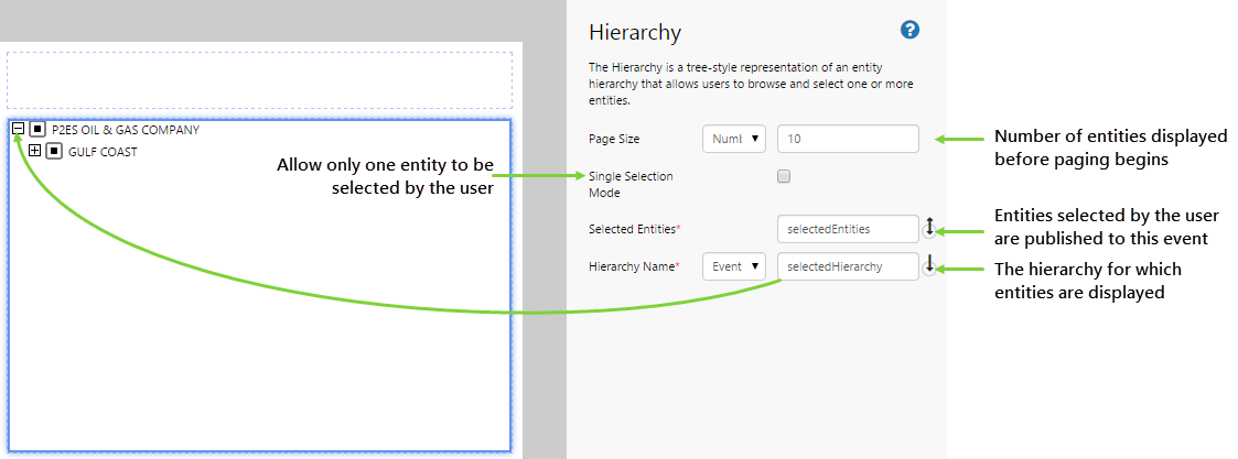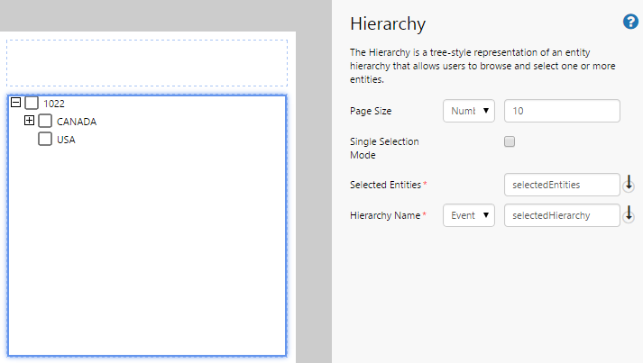 | Selected Entities: | The name of the event that the hierarchy publishes to. This event will contain the entities that are selected, and other controls (such as a chart) can listen to this event. |