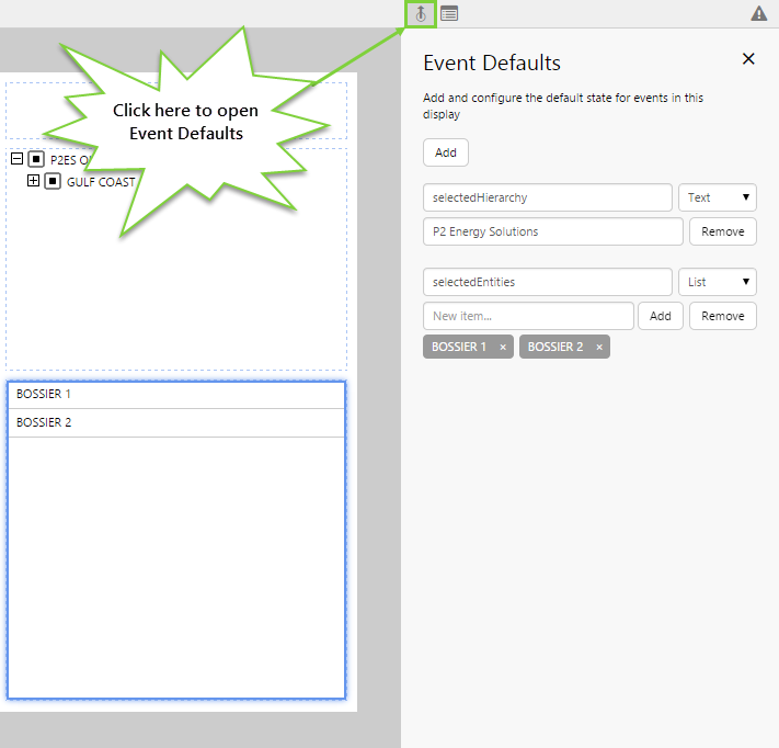 - Add an event called “selectedHierarchy” with the text P2 Energy Solutions. This will set the filter on the Hierarchy to only display entities belonging to that hierarchy.