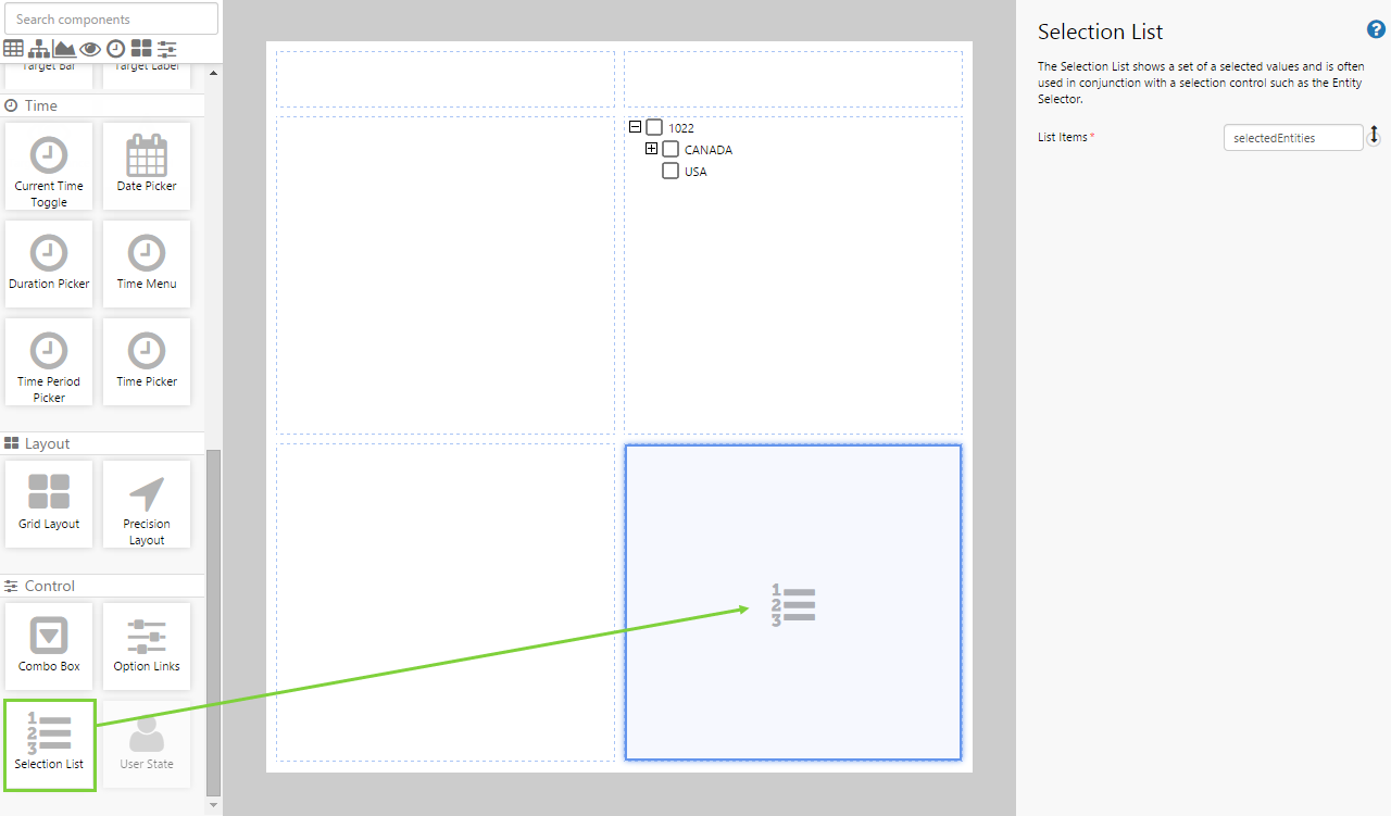 Drag and drop the Selection List component onto a grid cell, and configure it as follows: