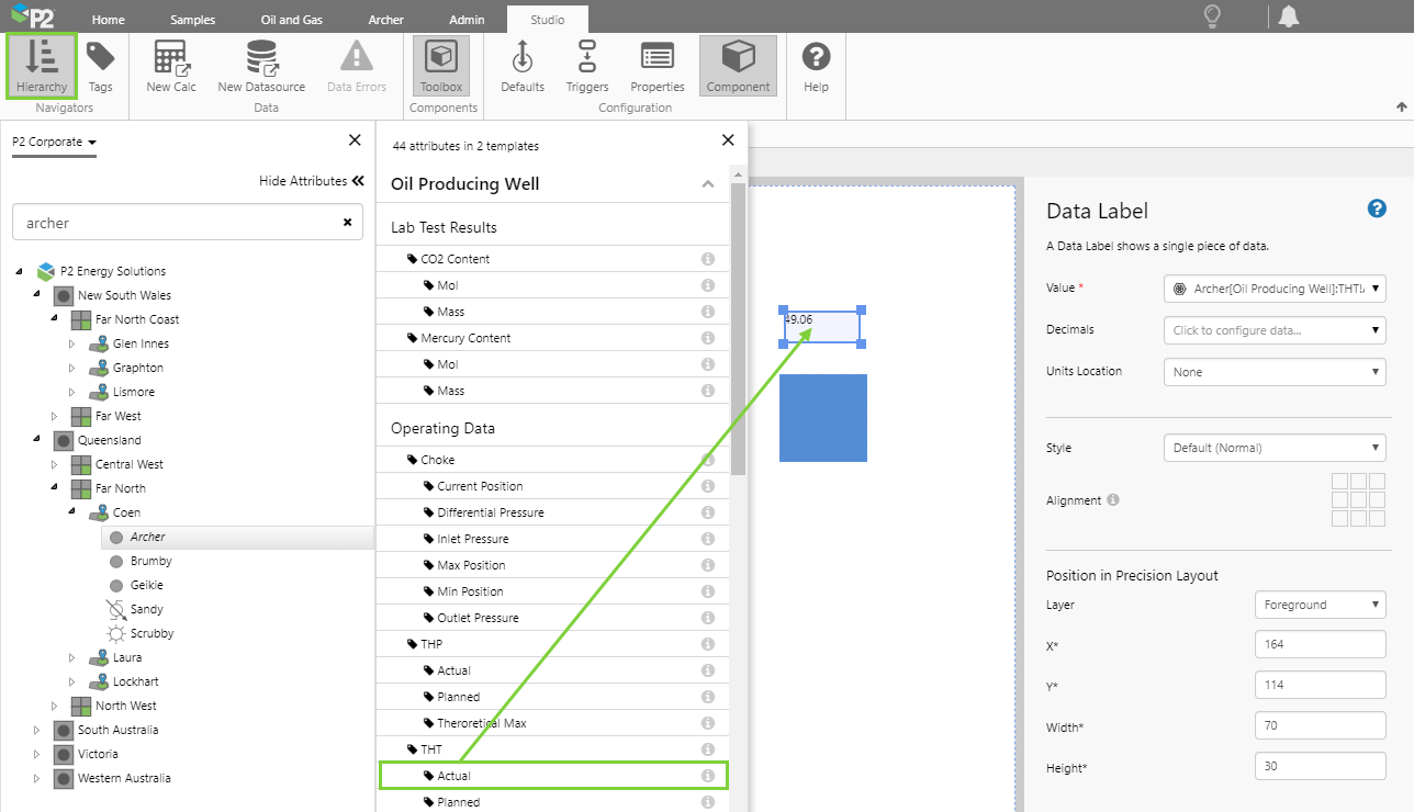 2. Navigate to an entity (Archer), open the Attributes panel, and then drag and drop an Attribute Value (THT Actual) onto the Precision Layout.