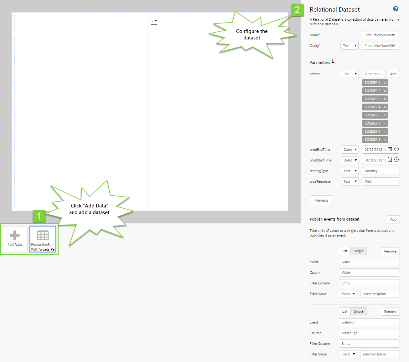 We will need some data to drive the comparisons, so let’s add this now. We’re going to add a dataset, and we're also going to publish some events from this dataset. The Image component will use these events to determine the conditions.
