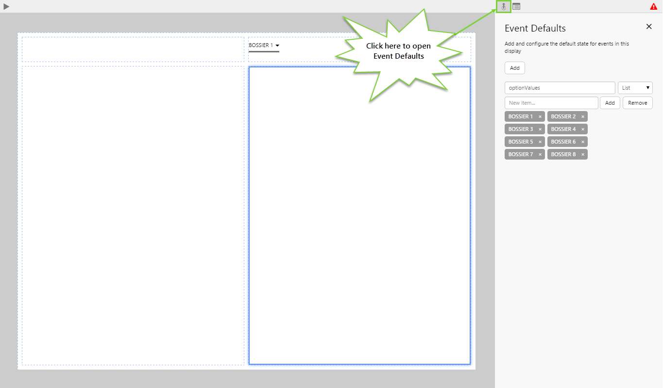 - Click the Event Defaults button to the right of the canvas.