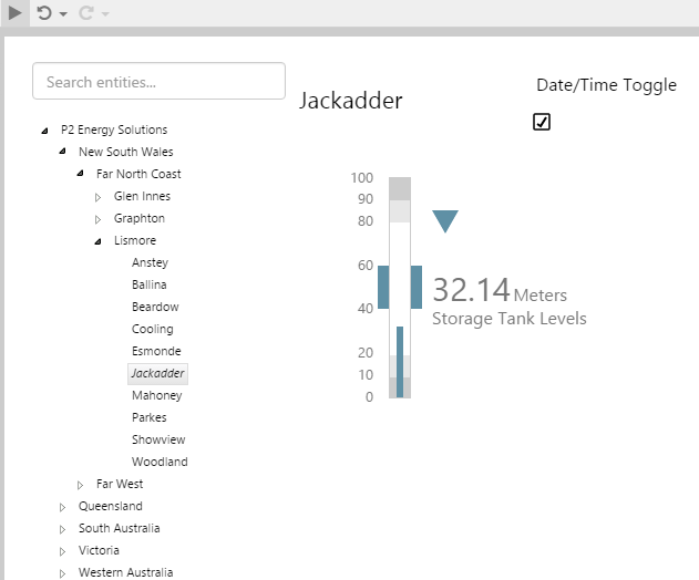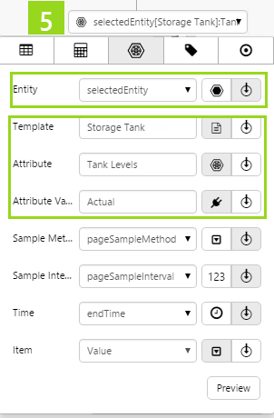 This assigns the selectedEntity's Tank Levels!Actual attribute value to the measured value: selectedEntity[Storage Tank]:Tank Levels!Actual. selectedEntity is a variable, which the end-user can change by selecting different entities from the hierarchy on the page.