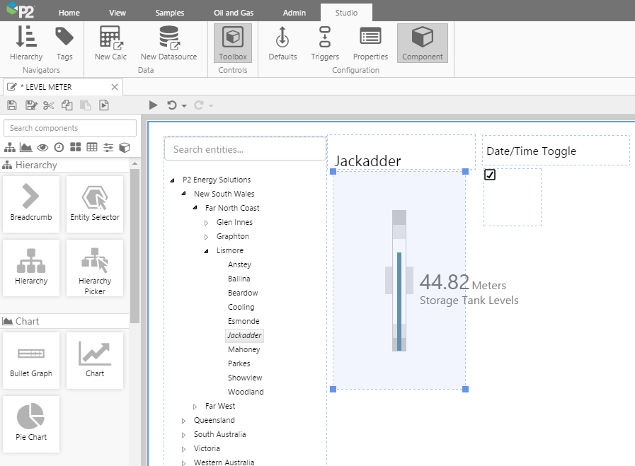 1. Drag a Level Meter component to the right of the hierarchy. (If you are using the saved copy of the Pressure Meter/Temperature Meter/Gauge page, first remove the Pressure Meter/Temperature Meter/Gauge component. Update the Default Value for selectedEntity to Jackadder.)