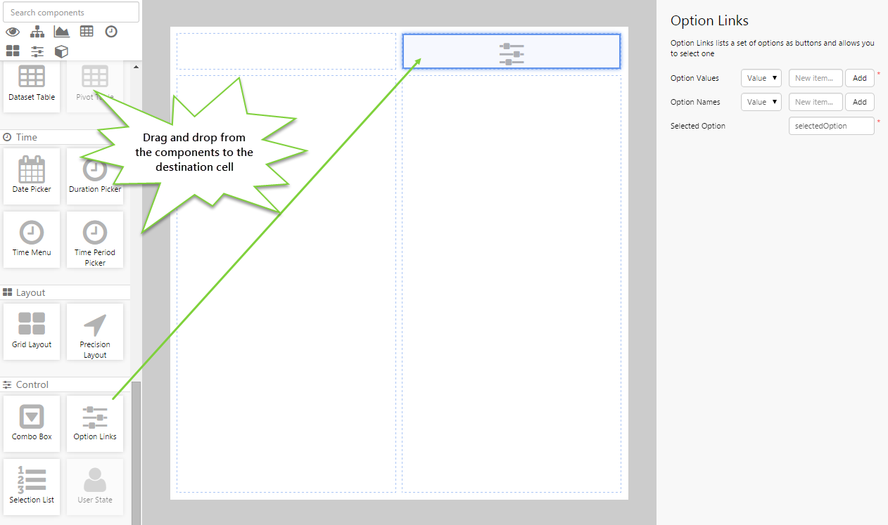 Drag and drop the Option Links component onto a grid cell.