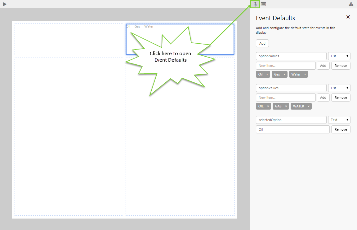In this example, the names differ from the values only in terms of case. If the database is in mixed case you can use this property to present the user with options that are all in upper case. - Create an event called "selectedOption" with a string value of Oil.