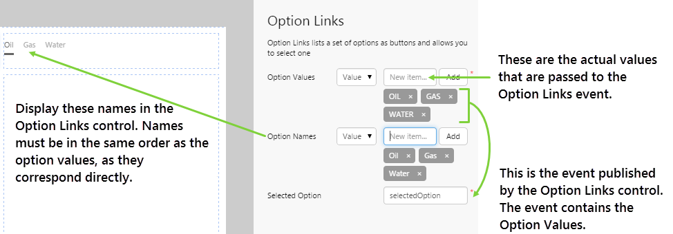 | Option Names: | The text that you want the control to display on the buttons. This can either be a set of values in text format, or you can populate the values from an event. The names must be listed in the same order as the values. |