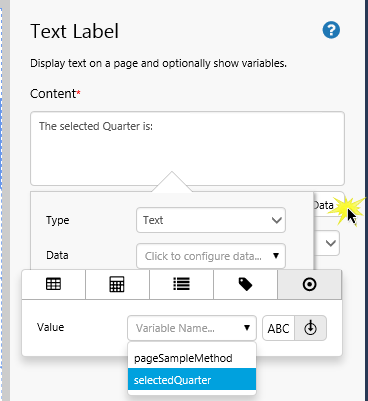 In the Content, type: "The selected Quarter is:" then click Add Data and add selectedQuarter.