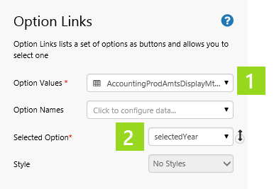 Option Links provide interactivity on your pages. You can pass the selected value to other components on the page, using a variable set in the Option Link's Selected Option property.