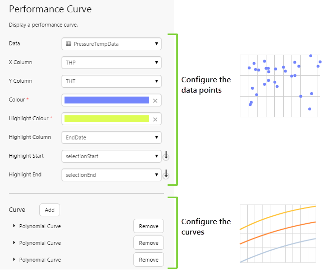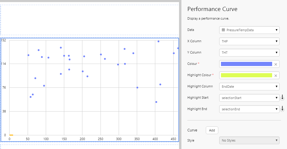 | Data | Use the Data Selector to specify the source of the data points. Data points can come from a dataset, tags, attributes, or calculations. As the performance curve shows correlation between two variables, such as pressure and temperature, the resulting set of values must supply both. Therefore: