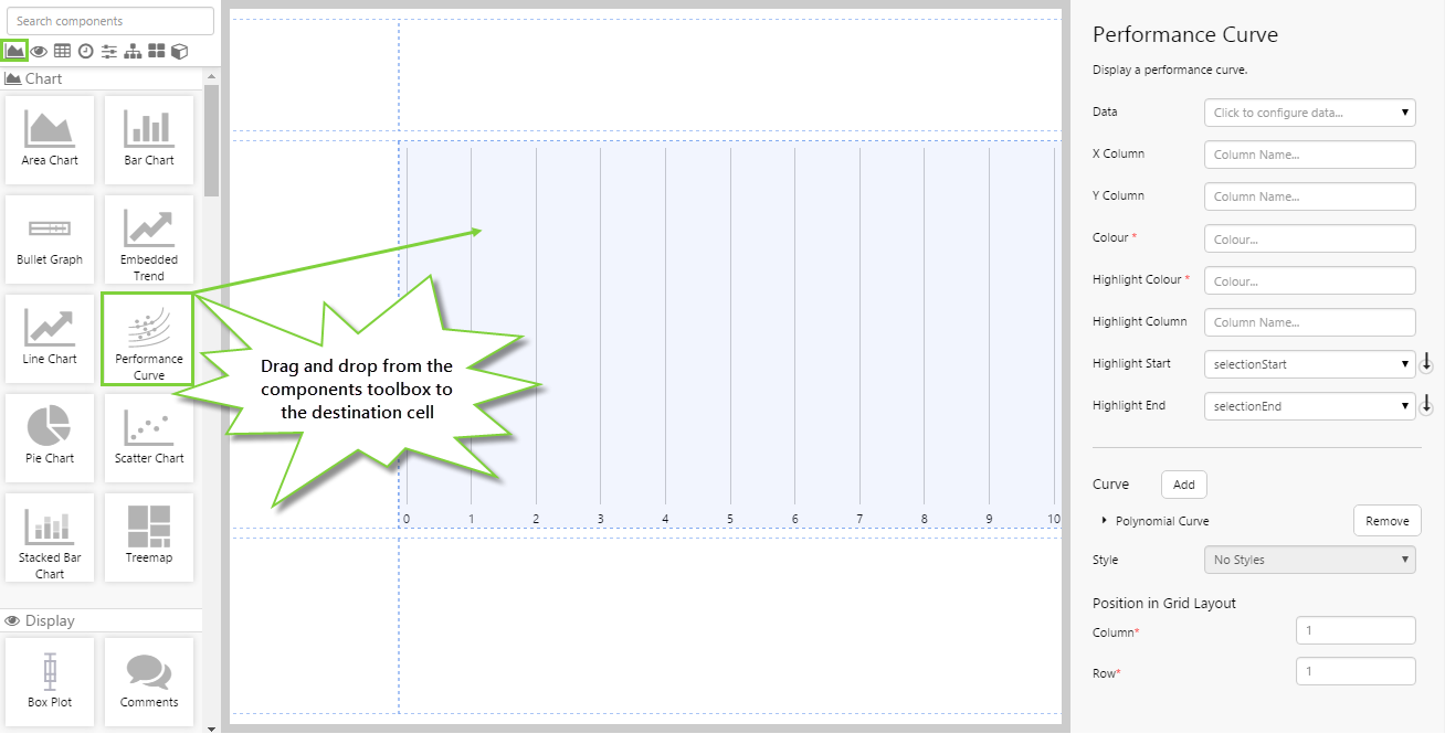 Drag and drop the Performance Curve component onto a grid cell. The Performance Curve is in the Chart