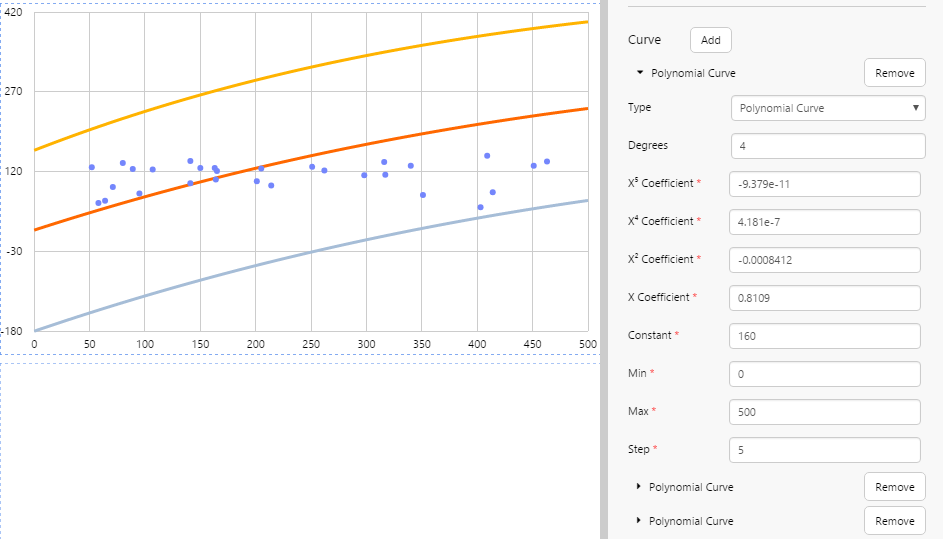 The Polynomial Curve draws a smooth line that is calculated using a polynomial equation with specified coefficients. If the equipment you want to analyse comes with specific details on the coefficient of curves, you should choose the Polynomial Curve.