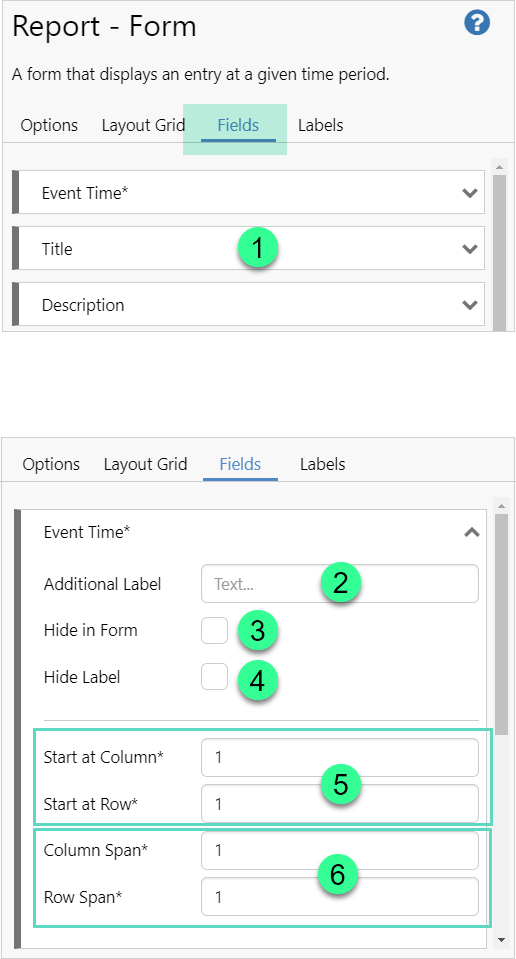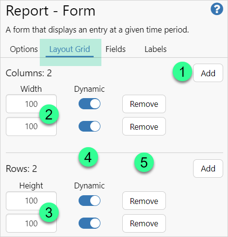 Enter the number of columns and rows to be used to display the field. The number and outline will be red if there is conflict with another field's position, or the span range extends beyond the Layout Grid.