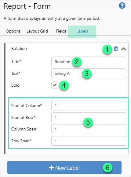 Select where in the report to position the label, and how much room to allocate for it.