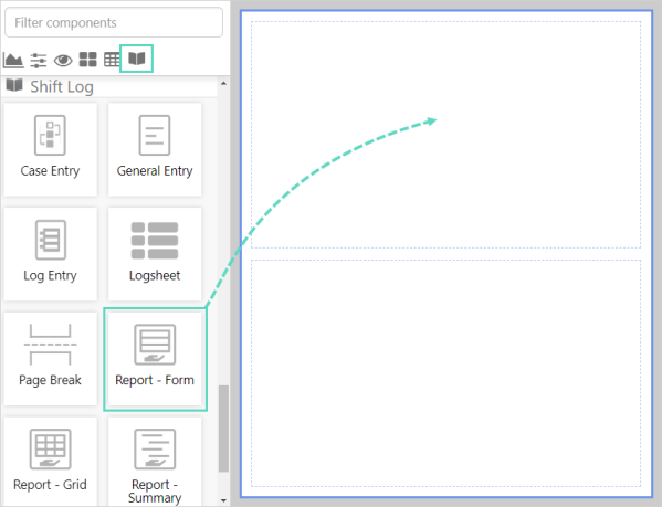 Drag and drop the Report - Form component onto a cell. The Report - Form is a part of the Shift Log