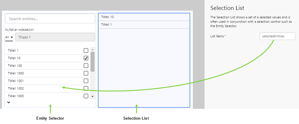 For example, you could have an Entity Selector component that offers a number of wells for selection. Perhaps you want the users to choose a maximum of 10 wells, and have the names of those wells displayed by the Selection List.